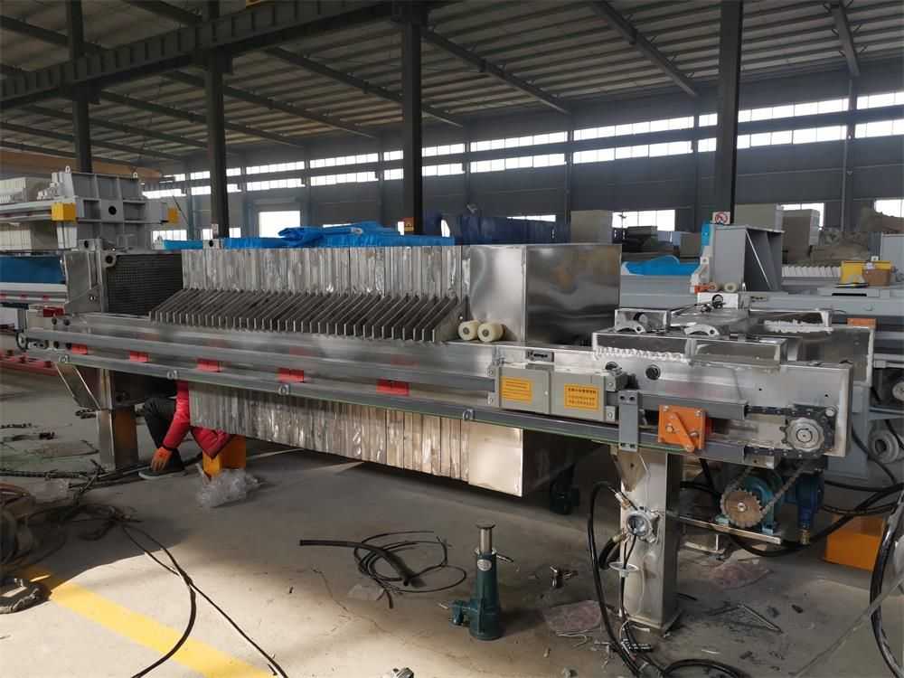 液壓廂式壓濾機(jī)由交替排列的濾板和濾框構(gòu)成一組濾室。濾板的表面有溝槽,其凸出部位用以支撐濾布。濾框和濾板的邊角上有通孔,組裝后構(gòu)成完整的通道,能通入懸浮液、洗滌水和引出濾液。板、框兩側(cè)各有把手支托在橫梁上,由壓緊裝置壓緊板、框。板、框之間的濾布起密封墊片的作用。由供料泵將懸浮液壓入濾室 在濾布上形成濾渣,直至充滿濾室。濾液穿過(guò)濾布并沿濾板溝槽流至板框邊角通道,集中排出。過(guò)濾完畢,可通入清洗滌水洗滌濾渣。